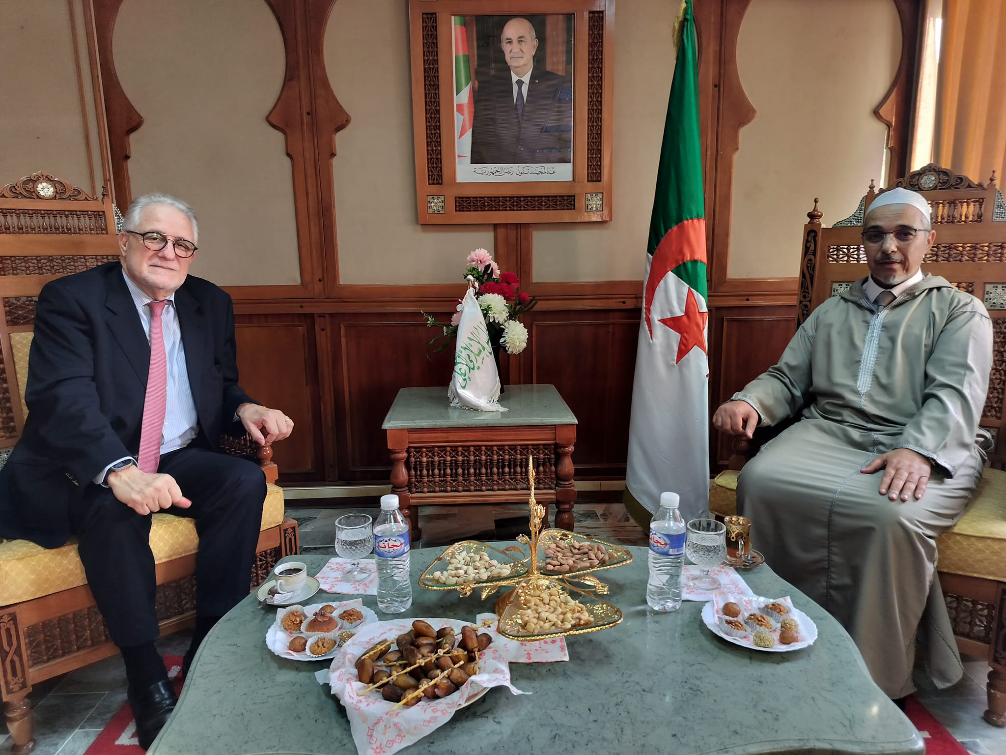 السيد شمس الدين حفيز عميد مسجد باريس الكبير و السيد محمد ونوغي مدير ادارة مسجد باريس الكبير خلال اللقاء ، تناول الطرفان سبل البحث لتعزيز التعاون بين المؤسستين و الرغبة في استغلال كفاءات المجلس الإسلامي الأعلى في تنوير الجالية المسلمة في فرنسا.