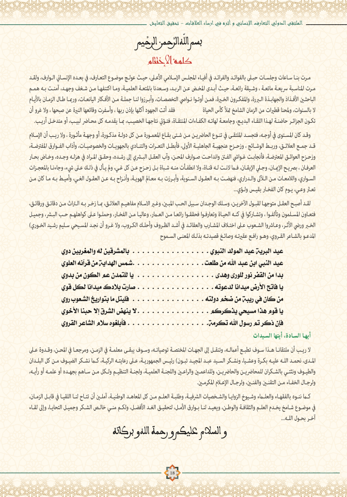 ٍٍكلمة اختتام الملتقى الدولي “التعارف الانساني وأثره في ارساء العلاقات وتحقيق التعايش”