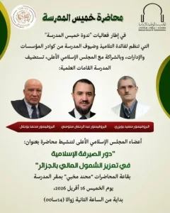 السيد رئيس المجلس الإسلامي الأعلى يحلّ بولاية البليدة استُقبل صبيحة اليوم الأربعاء، 15 أفريل 2026، رئيس المجلس الإسلامي الأعلى، الأستاذ الدكتور مبروك زيد الخير، من طرف والي ولاية البليدة السيد جمال الدين حصحاص، وذلك بمقر الولاية. تأتي هذه الزيارة في إطار مشاركة السيد رئيس المجلس في فعاليات إحياء يوم العلم، حيث سيُلقي محاضرة علمية بجامعة البليدة 2 “لونيسي علي”. وقد جرى الاستقبال بحضور السلطات المحلية والولائية، يتقدمهم رئيس المجلس الشعبي الولائي والسيد النائب العام، إلى جانب مدير الشؤون الدينية والأوقاف للولاية.