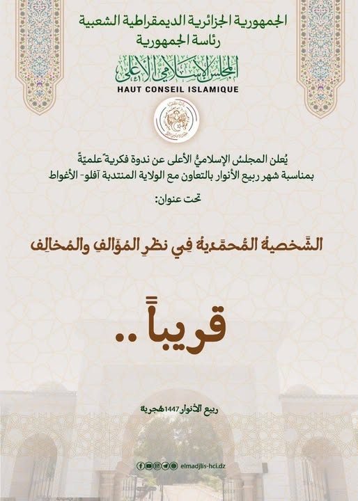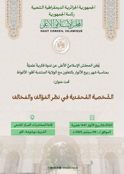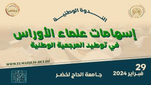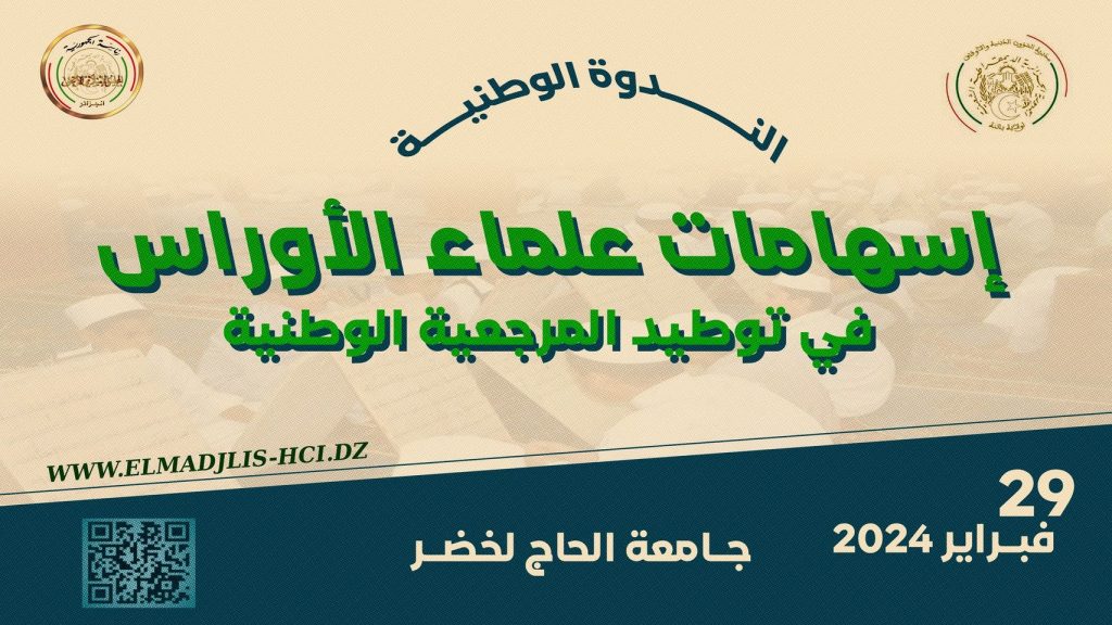 ينظم المجلس الإسلامي الأعلى بالتعاون مع مديرية الشؤون الدينية والأوقاف لـولاية باتنة ندوة وطنية حـول موضوع:(إسهامات علماء الأوراس في توطيد المرجعية الدينية الوطنية) وذلك يوم 29 فيفري 2024 بجامعة الحاج لخضر.